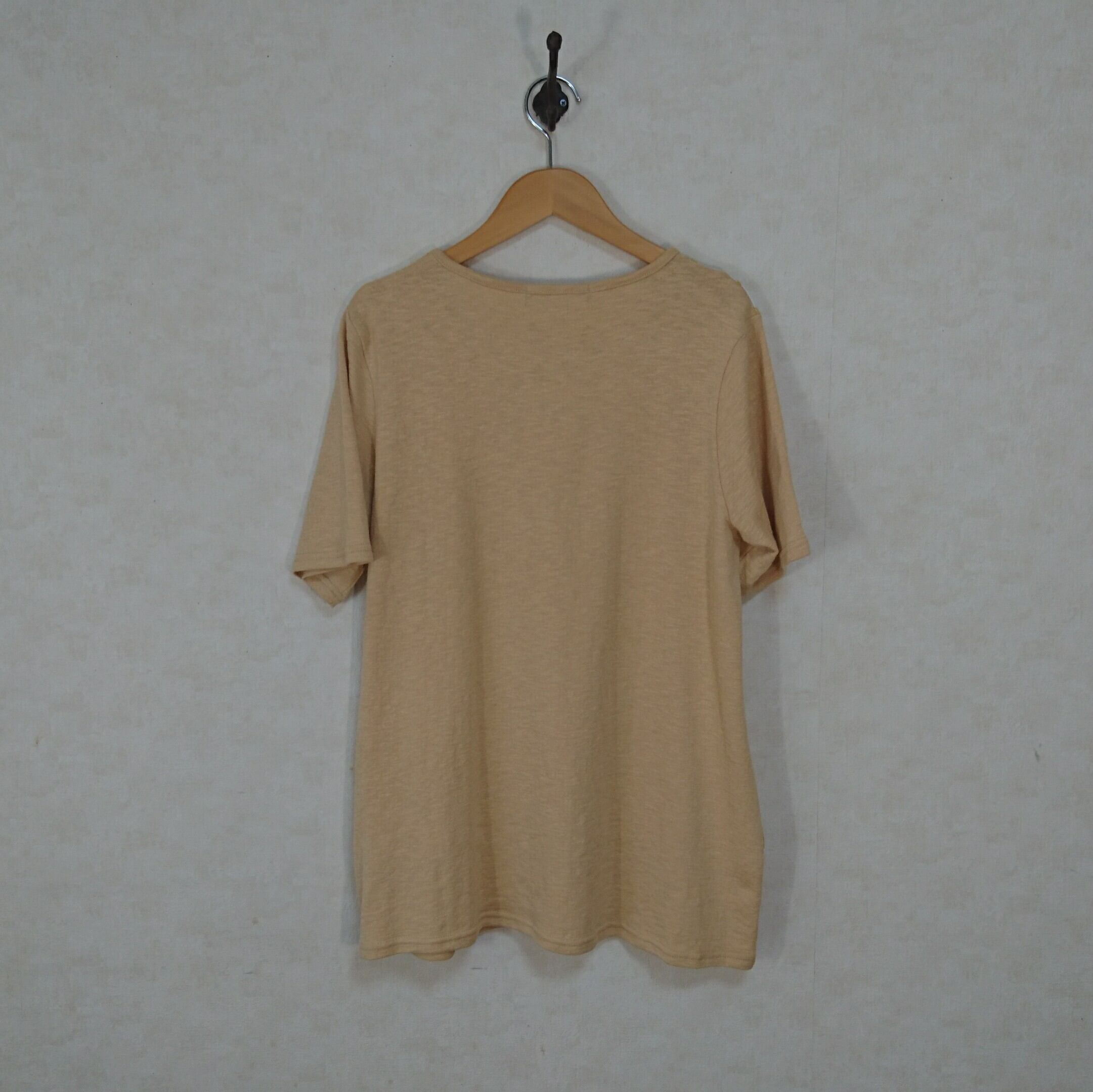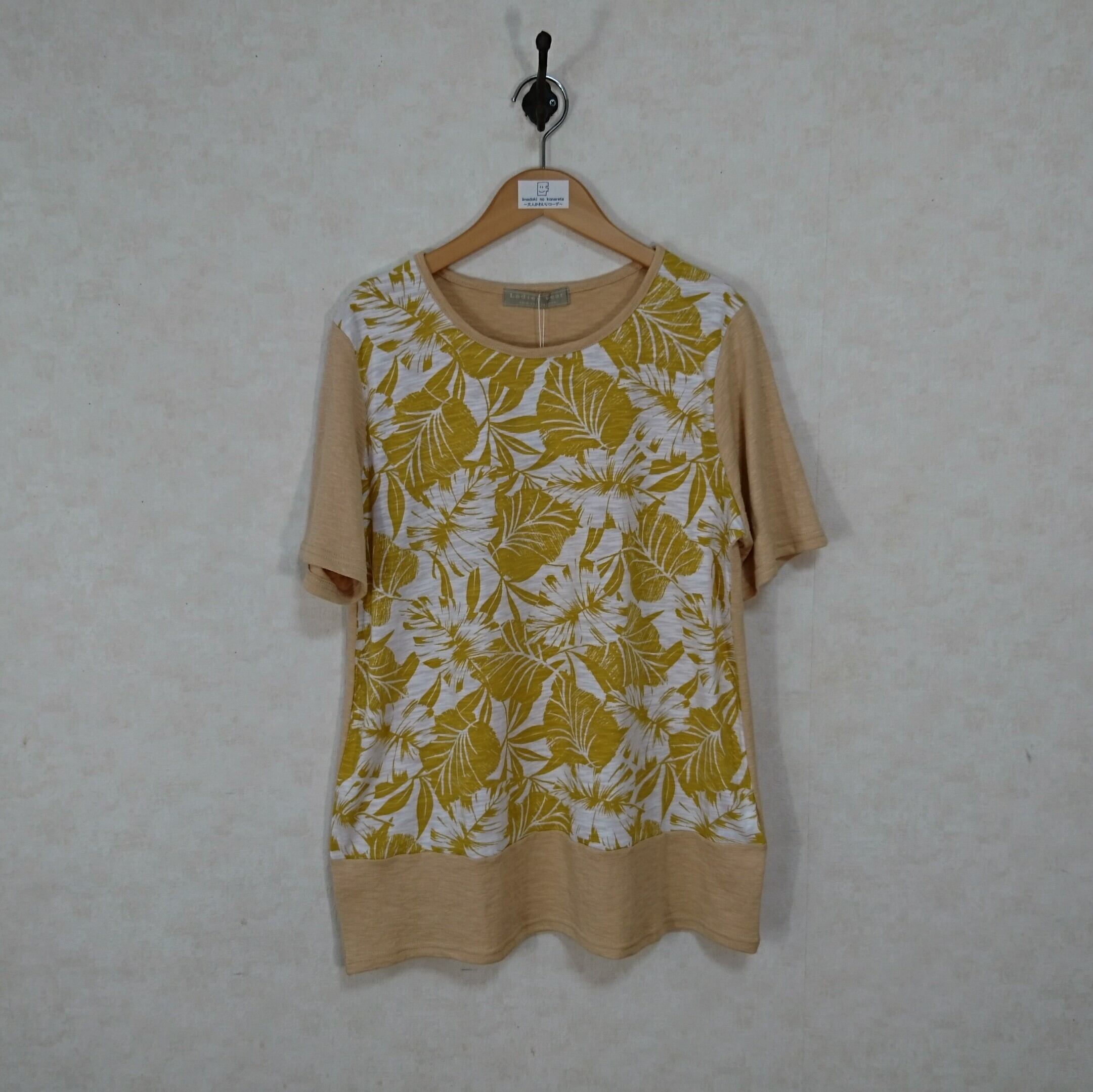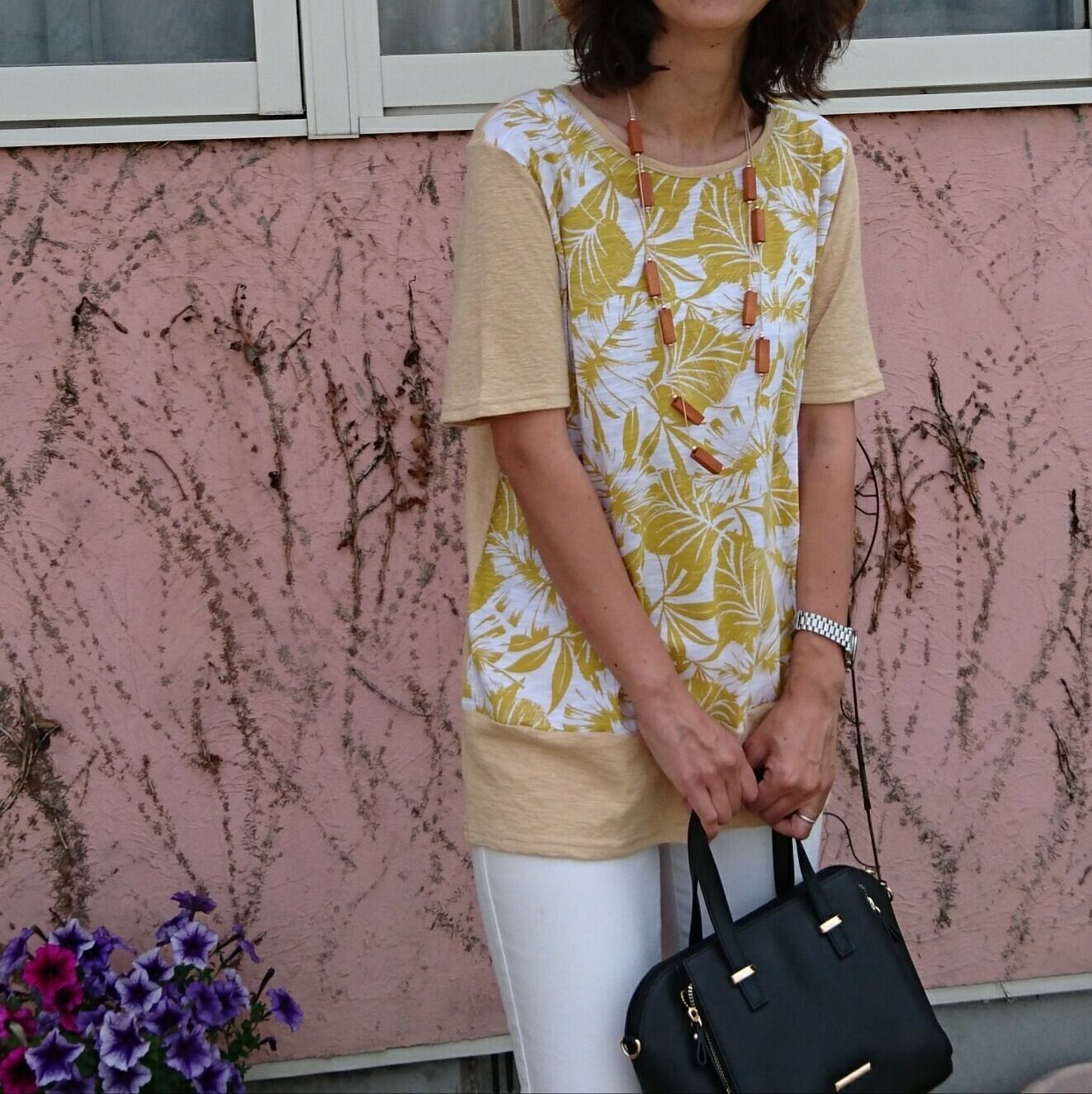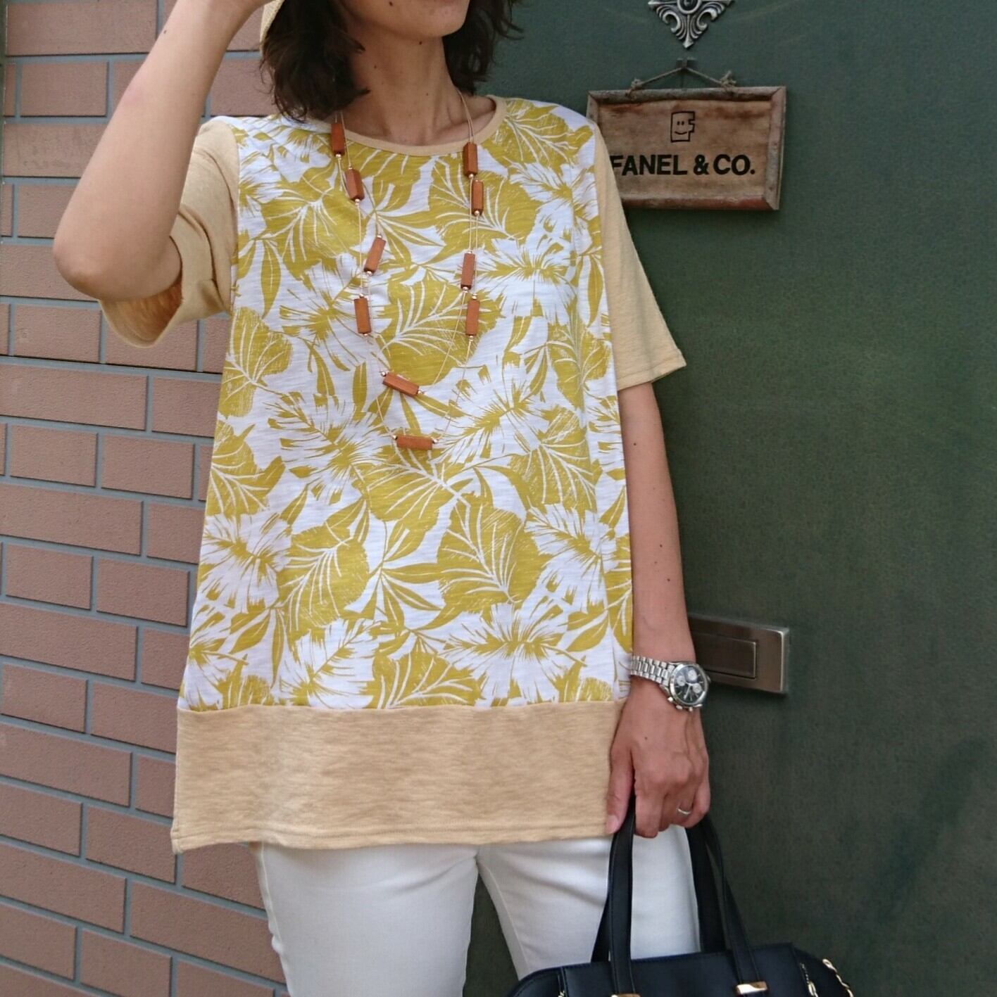 今どきのこなれたおしゃれアラカンコーデ ボタニカル柄プリント切替スラブTシャツ