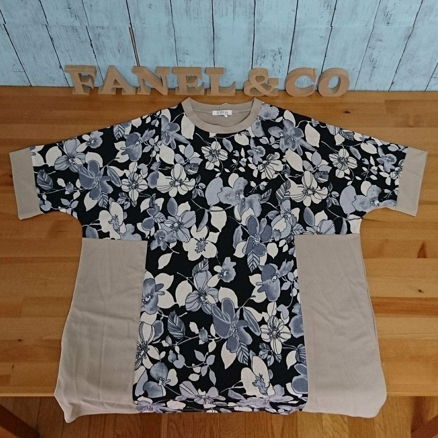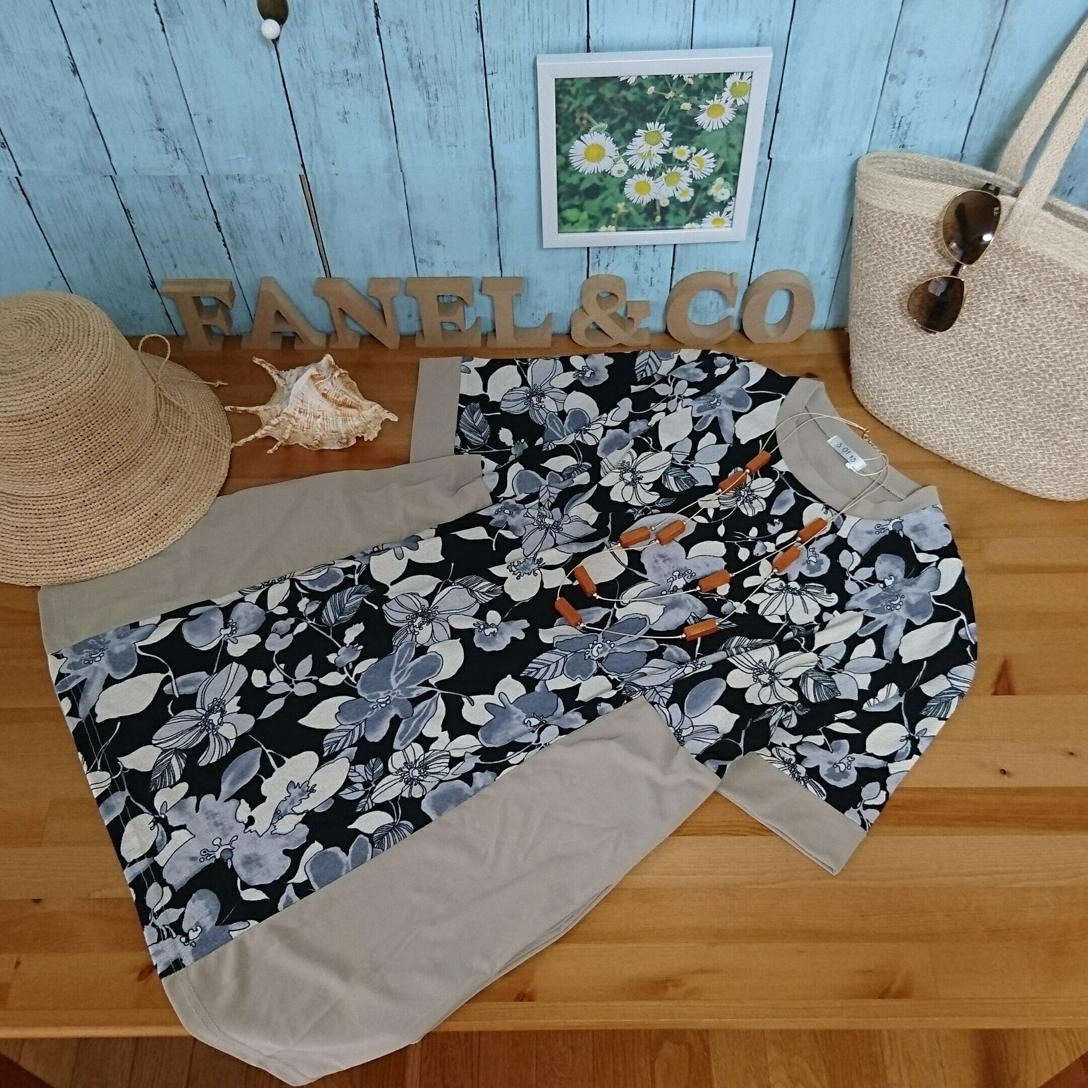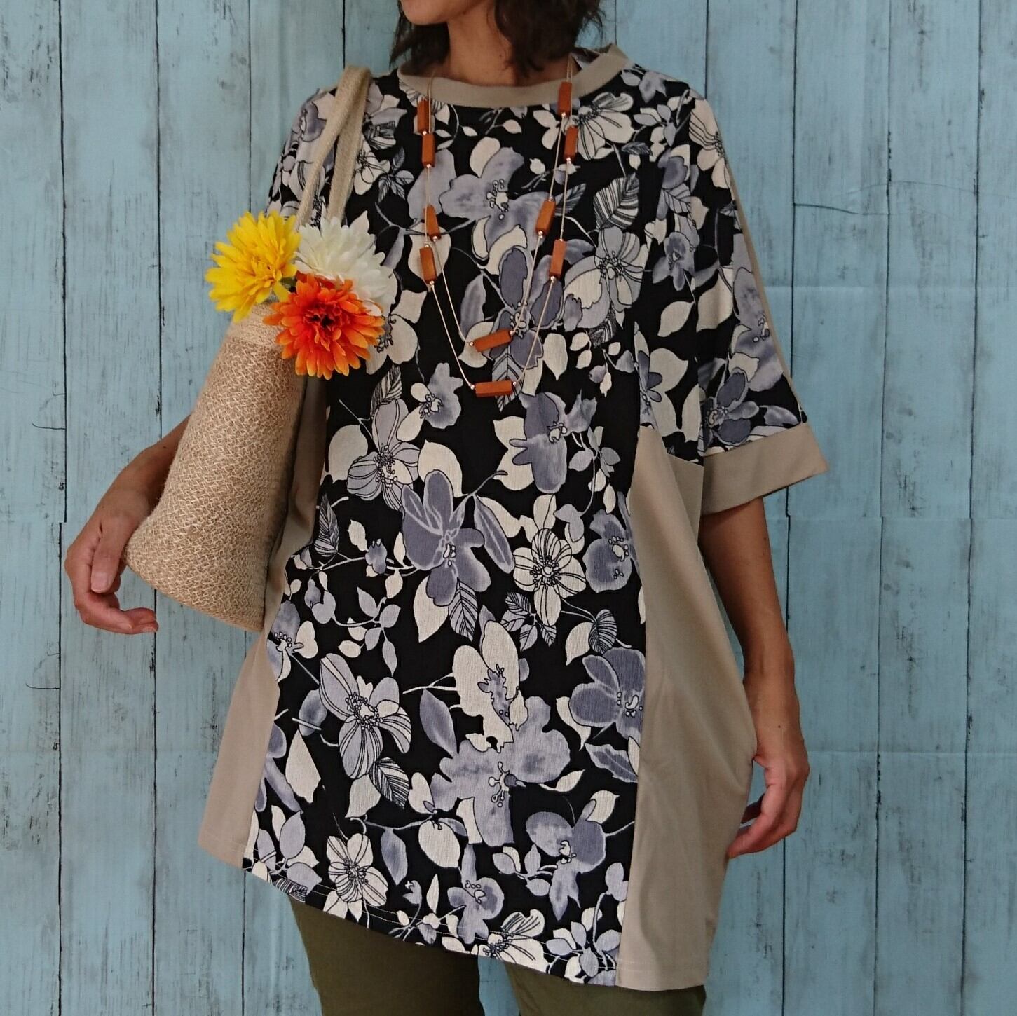ニュアンスベージュを着こなす アラカンファッション トレンドのビッグシルエットを花柄の切替Tシャツで