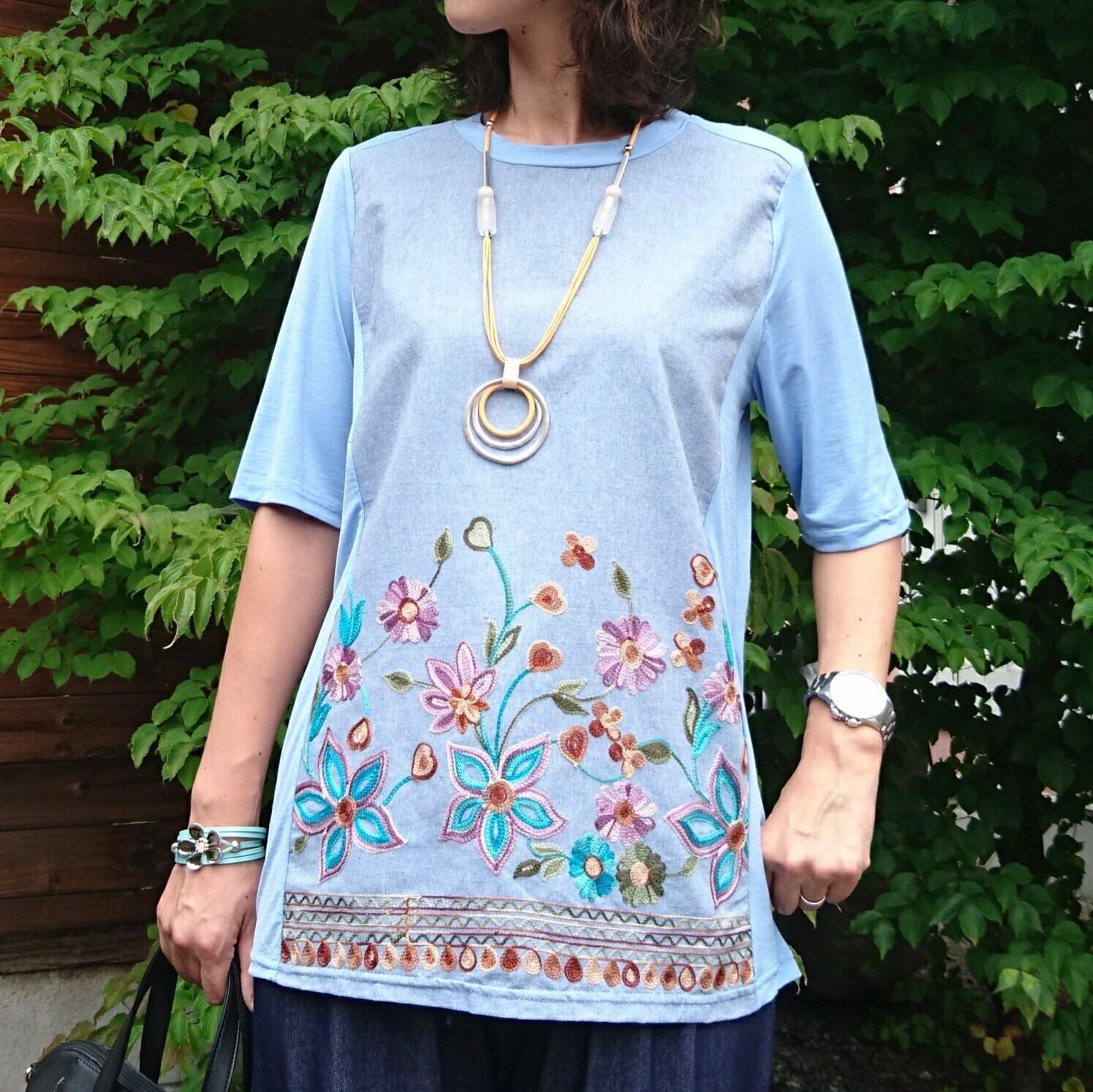 エスニックリゾートな アラカンファッション ダンガリー生地にカラフルなチェーン刺繍の切替Tシャツ