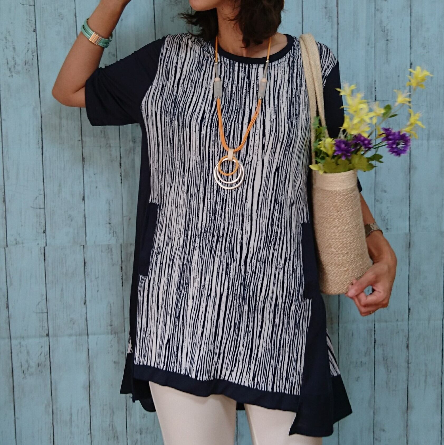 縦目のプリント切替は体型がごまかせて地味見えも防止